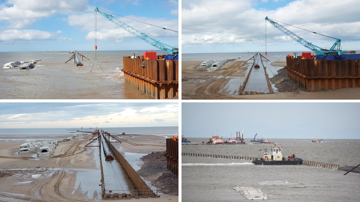 The sheet piled tidal cofferdam was constructed throughout all times of the day to utilise the working window whilst the tide was out, with noise levels monitored throughout. The cofferdam was 7.2m wide, constructed from 12m piles and protruded 1.1m above the beach level at time of construction. This was to ensure that a safe level of edge protection was provided during the period of construction and to prevent the public from entering the trench. In addition there were markings on the beach and a 24/7 security presence. Circular guide piles constructed from 0.50m diameter steel tubes, were installed at 40m centres on alternating sides of the trench. These were installed to ensure the pipe stayed within the confines of the cofferdam in all states of the tide when being winched in.