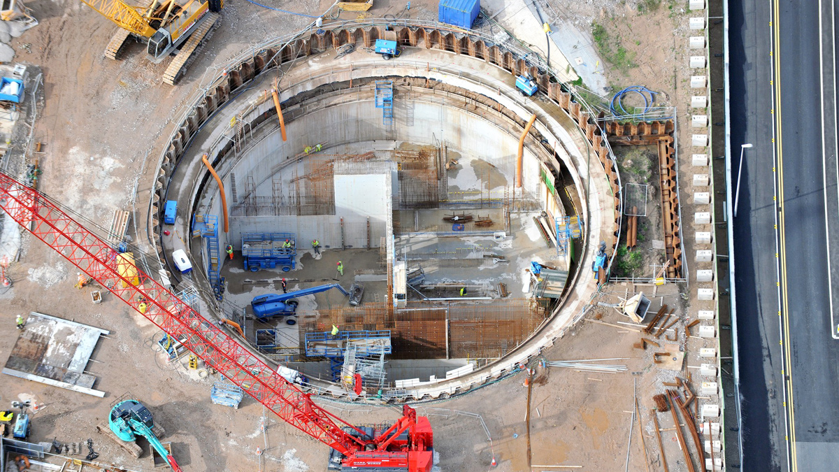 Aerial image of 32m diameter x 20m deep shaft for pumping station construction – Courtesy of United Utilities