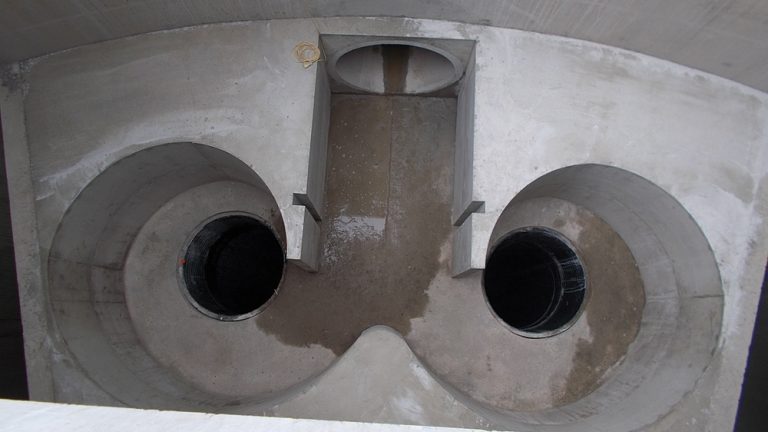 A soft eye was included in the shaft wall to receive the incoming 1,800mm sewer. Box outs were cast into the wall for support steelwork for the vortex scroll box and for shear connectors to the base, avoiding the need for post drilling.