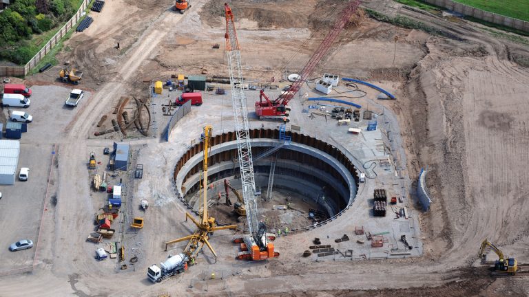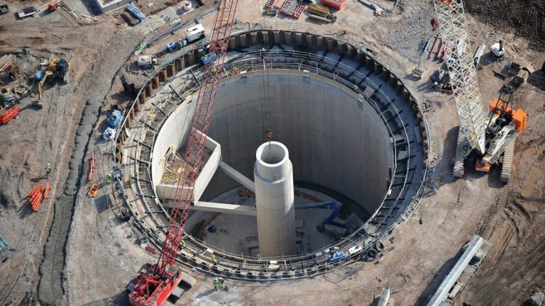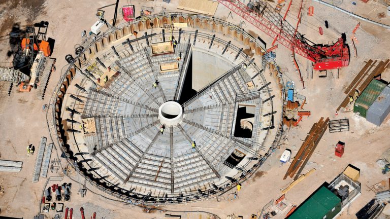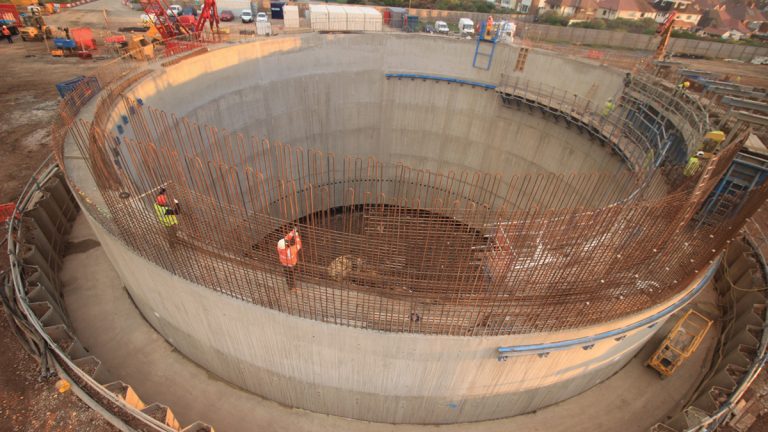 The base was cast in four pours, two for the 5m deep structural base and two for the 1.7m deep benching. Careful consideration was paid to the concrete specification to account for heat generation and to achieve the required durability criteria. Four concrete suppliers were used to mitigate supply risks.
