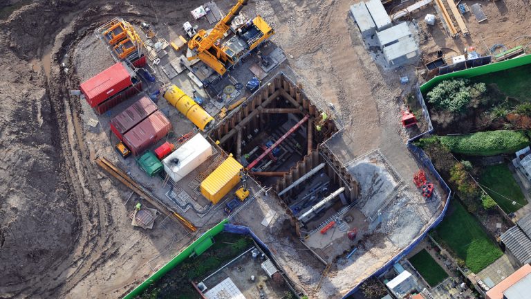 The shaft was constructed in two phases. The initial phase comprised installing a temporary sheet piled cofferdam and excavation to 12m depth, installing 3 (No.) lines of reinforced concrete ring beams at 3m, 8m and 12m depth, to act primarily as TW support to the cofferdam but also as guide collars to control shaft sinking. Prior to the installation of the temporary piles the ground along the location was pre-augered close to depth to aid driving and minimise impact of noise and vibration. The upper and lower concrete collars were subsequently incorporated into the permanent works (upper ring beam dowelled to the final wall pour and the lower ring beam attached to the upper via tension columns). This allows for mobilisation of a soil wedge to help resist flotation and lead to a more efficient design.