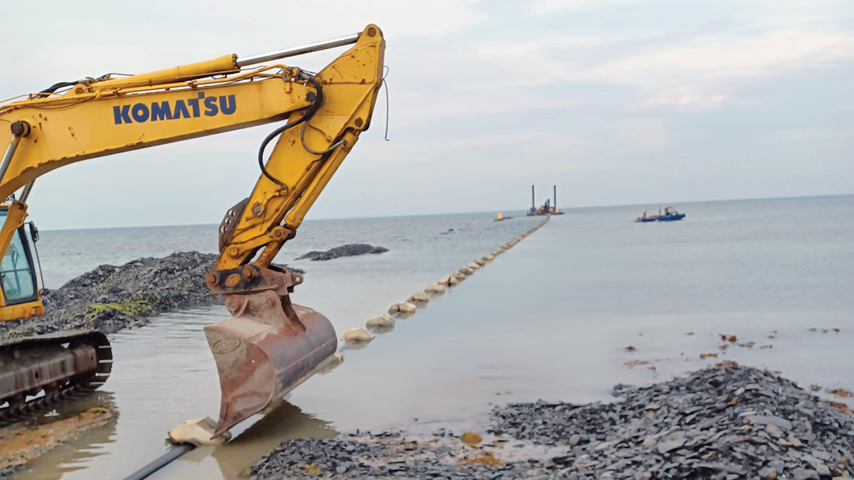Shore-based excavation work was completed at low tide to re-excavate the trench along the intertidal zone previously proven in phase 1 of the works in preparation for pipe tow-and-sink operation.