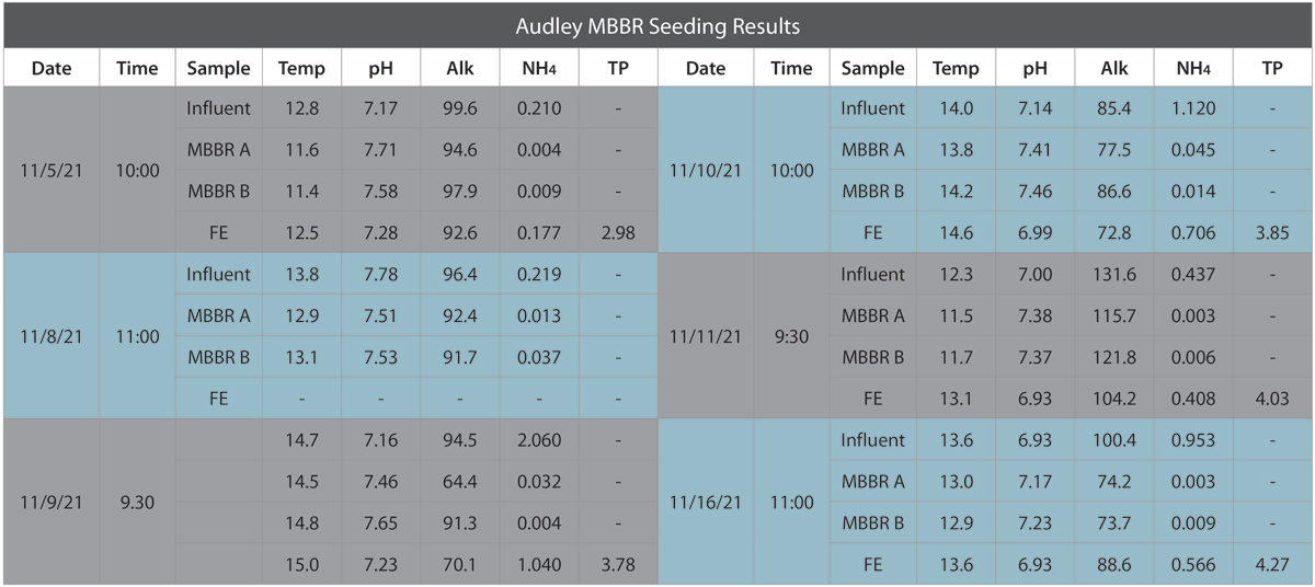 The new MBBRs were sampled regularly and media film growth examined. Within one month the MMBR filter media had clearly darkened in colour, signifying the effectiveness of the seeding process. The progression of this process is evident in the following table of MBBR sampling results: