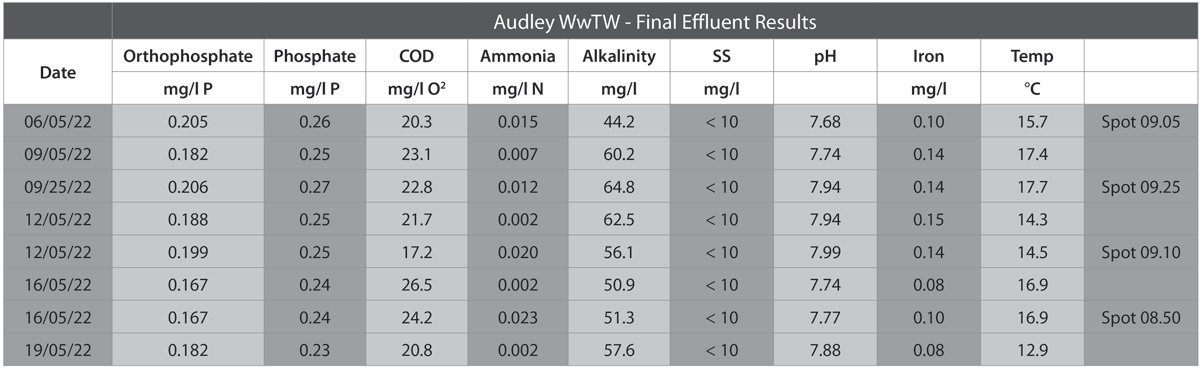 The secondary ferric dosed at the front end of the MBBRs, within the air mixed splitter chamber, has had no effect on the measured ammonia removal rate following its introduction. The table below demonstrates the levels of performance achieved by the design solution operating at Audley WwTW.