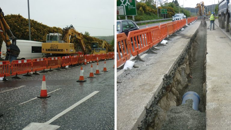 (left) Traffic management in place along Craigmore Way, Newry and (right) 500mm Ductile Iron Pipe being laid along Craigmore Way, Newry – Courtesy of NI Water