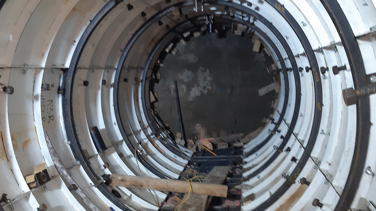 Proceeding section by section, it took two and a half weeks to reach the TEM. Removal of the damaged lead pipe revealed that, under the pressure of sitting stationary in the ground for five months while the recovery strategy was devised and implemented, the tail skin of the machine had deformed more than anticipated.