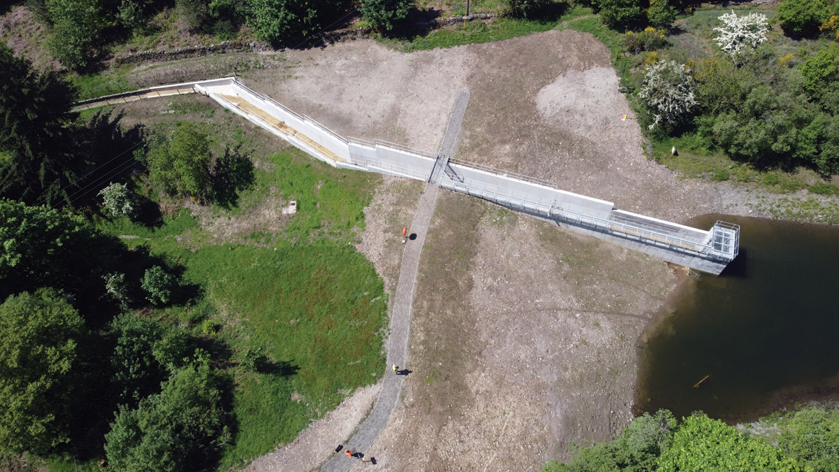 Aerial view of completed spillway with basin refilled and footpath reopened – Courtesy of Eric Wright Civil Engineering