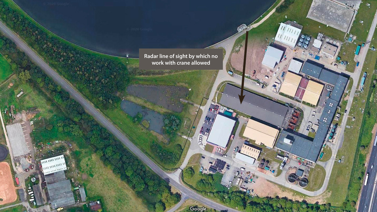 The site is located near to a radar scanner for the East Midlands airport. The working area for the GAC building was reduced by a third for crawler cranes, to prevent the jib interfering with line of sight of radar.
