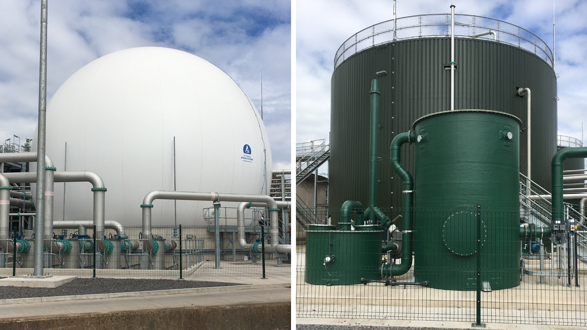 (left) Gas holder and (right) anaerobic digester in the background with odour control unit in the foreground – Courtesy Welsh Water and Skanska