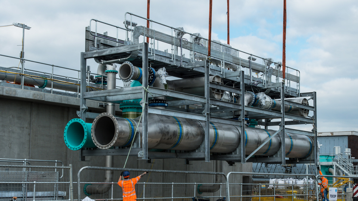 The filter inlet/outlet pipework consisted of six modules, which included all flowmeters, valves, actuators, pipework, access walkways, handrailing, lighting and electrical distribution boards. The modules were assembled, wired, fully tested and commissioned within the factory before breaking down into large pieces for site installation in four lifts. This was the first-time modules of this size have been manufactured as a complete DfMA unit, including all electrical installation and testing.
