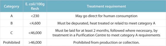 - EU Food Hygiene Regulations (852/853/854): The quality of commercially harvested shellfish intended for human consumption must comply with the EA Food Hygiene Regulations (852/853/854), which became UK law on 1st January 2006. The regulations set microbial standards for the flesh quality of shellfish harvested from designated areas. Harvesting areas are classified according to the extent of contamination shown by monitoring E. coli in shellfish flesh. Treatment processes area stipulated according to the classification status of the area. The classification categories are noted in Table 1.