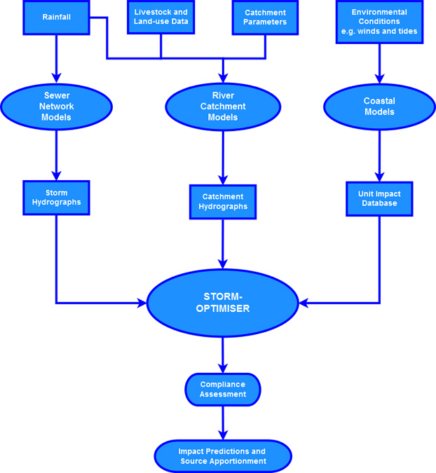 The STORM-OPTIMISER software was calibrated at each of the Full Assessment sites for the preceding 11 years using historic monitoring data at the BW and SW sites. Inputs to the STORM-OPTIMISER software included an 11-year simulation of each asset, provided by the network models, and the water quality simulations from the coastal models for the full range of environmental conditions assessed, to ascertain the pathway between source and receptor. For a schematic illustration, see figure 4.