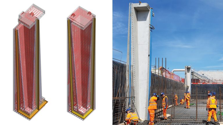 For the second set of tanks, the design was changed to fabricate the wall corners and junctions as a precast item off site. The in situ reinforcement design was transposed into discrete corner pieces with couplers on each face, with up to four layers of bars, constructed off site, delivered in time and landed in prepared positions. Each precast concrete corner piece was 8.5m high and weighed 25 tonnes. Threaded bars were then screwed into the couplers on site and the wall steel fixing continued from corner to corner. This was both, safer and saved weeks of construction time. Precast concrete was used for the main baffle wall panels and support columns, as well as the IFAS guide columns. Columns were installed using corrugated grout pipes in the precast components, grouted on to stainless steel starter bars.