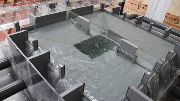 The pumping station was modelled physically and as a result, the design developed to include flow conditioning measures and surge protection weirs in the event of total pump trip during a storm event.