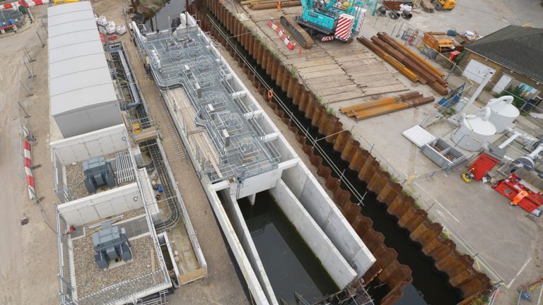 As and when the storm tanks are filled and the works storm flow runs to river, the 10m3/s capacity canister pumps will lift the flow to discharge to side channels that bypass the closed penstocks. This gives the works the ability to overcome the future storm river level at maximum output and protects the site from flooding.