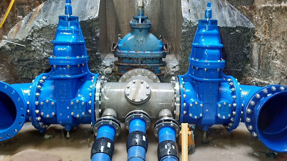 A new fabricated manifold that incorporated two further gate valves at right angles to the original valve location were installed. If additional drawdown capacity is needed at any time, these valves will be opened and water will flow out through the tunnel.