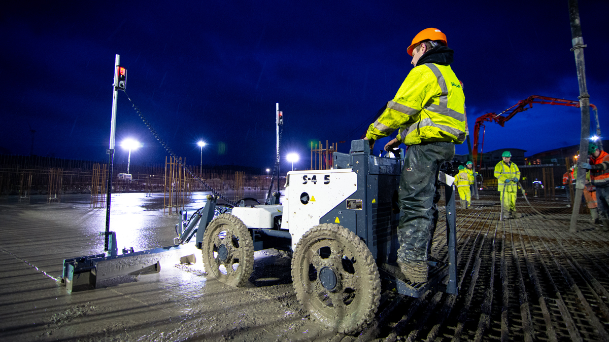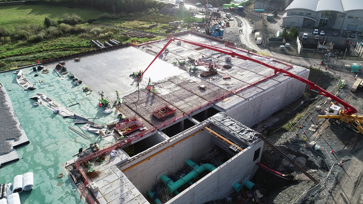 Three concrete pumps (56m, 47m and 42m reach) were used to place the concrete in the base slab with a continuous supply of up to 36 concrete lorries. Concrete was delivered to the required location by the concrete pump tremie pipe and levelled using a screed unit equipped with the latest survey technology to achieve the required gradient of 1:100 at any location on the base.