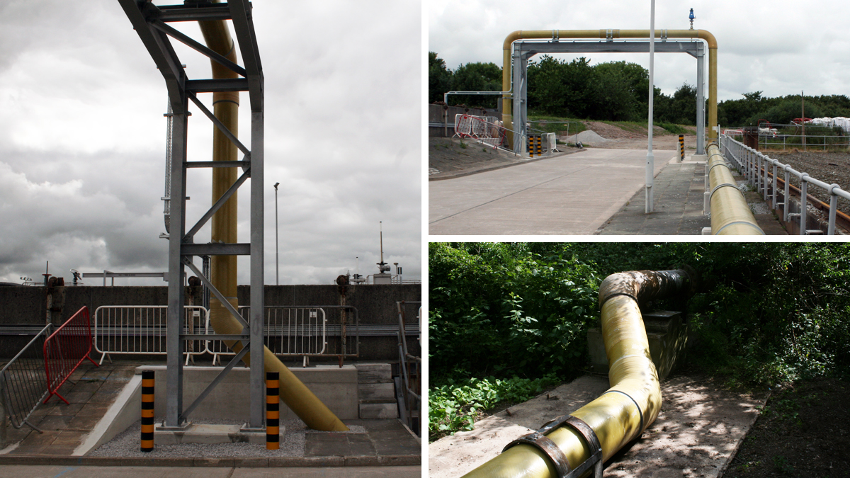 A 400mm diameter glass reinforce epoxy (GRE) pipe was installed. The pipe length was 600m and this included three road crossings on pipe bridges, and a bridge support across a brook. The new pipeline was pressure tested in April 2022 ready to take the new flows from Essar. On Wednesday 11 May 2022 the new flows started to arrive from Essar.