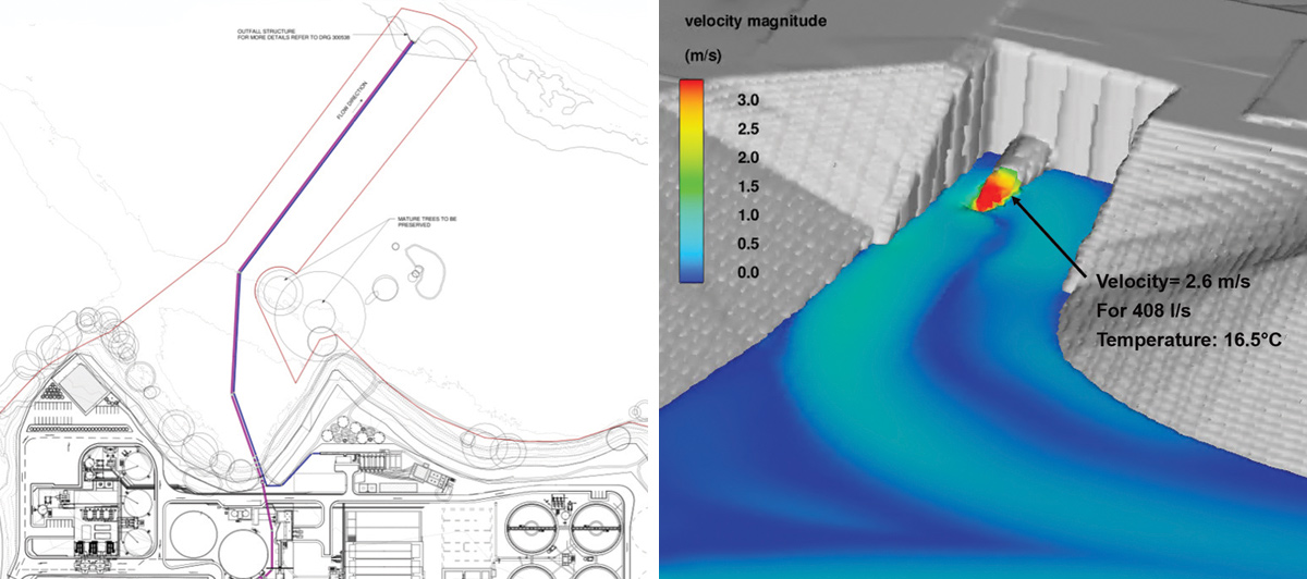 (left) Outfall route plan – Courtesy of Bam Enpure Ltd JV, and (right) outfall low flow scenario CFD model – Courtesy of Arcadis