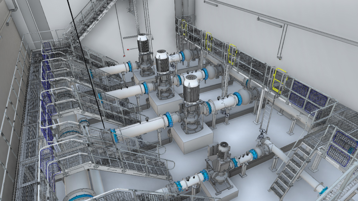 Refurbished pumping station: (left) 3D model – Courtesy of TES Group and (right) pumping station layout – Courtesy of Essex & Suffolk Water