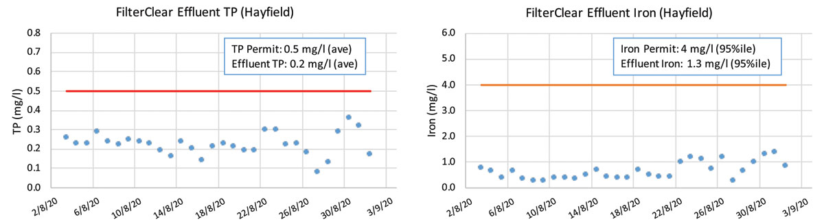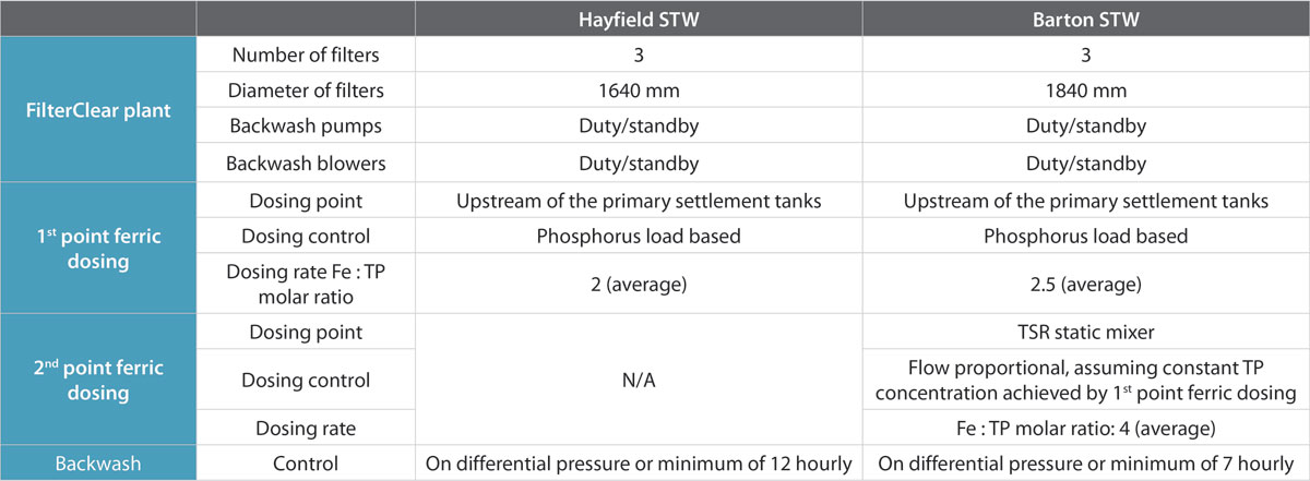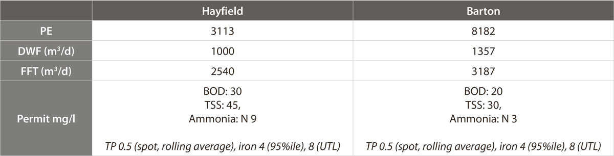 At Hayfield and Barton, FilterClear plants designed to meet the 0.5 mg/l TP discharge permit were installed downstream of the existing trickling filter works.