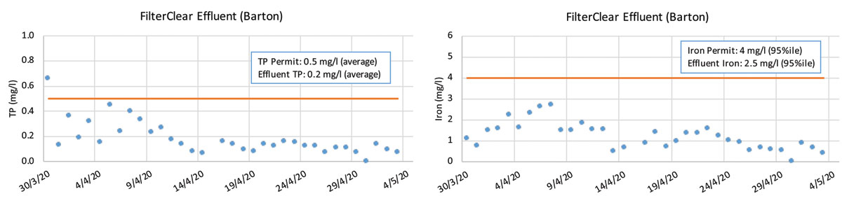 A tight delivery programme at Barton meant that the commissioning duration was unusually short. In addition, the crude sewage TP averaged at 9 mg/l. The FilterClear plant stabilised quickly. The effluent TP concentration started at 0.6 mg/ and quickly dropped below 0.2 mg/l. Since commissioning both the TP and iron permit have been achieved with good safety margins. Over time, the reserves of P within the trickling filters have diminished and the ferric dosing has been reduced.