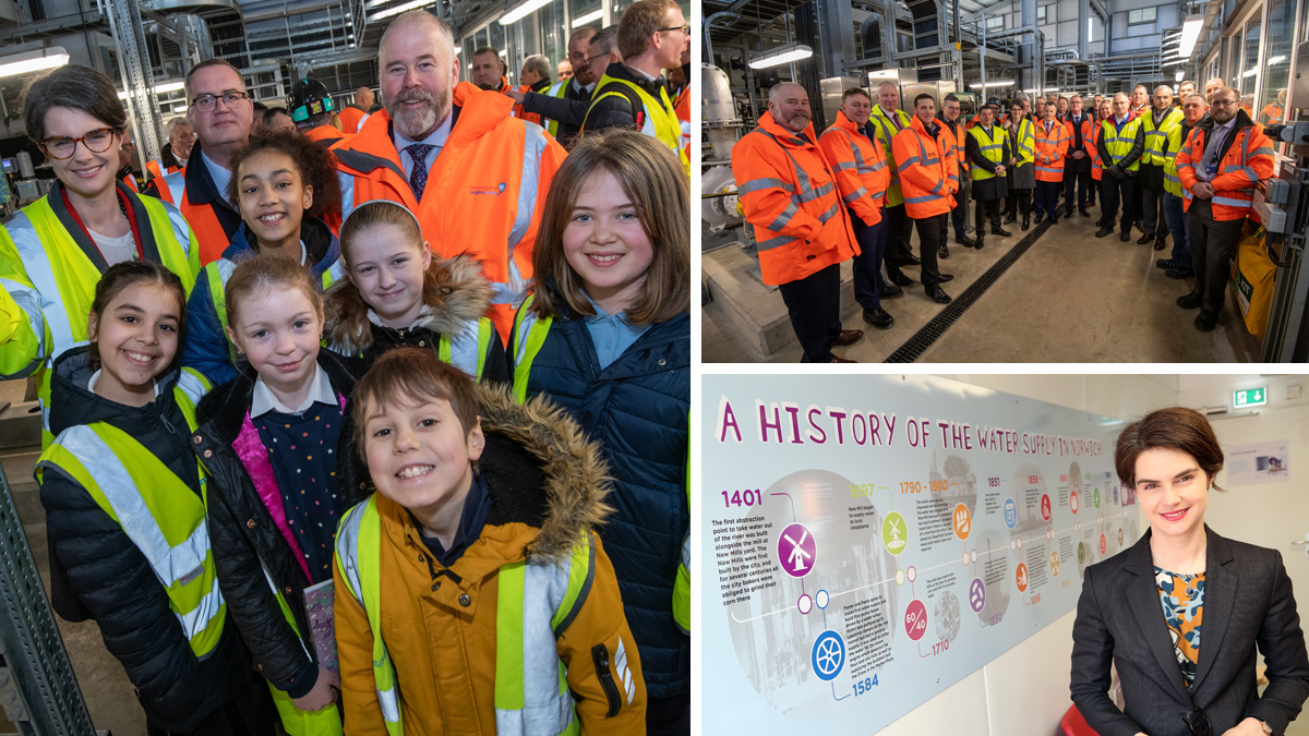 (left) Chloe Smith MP, competition winners from Wensum Junior School and Anglian Water’s Paul Naylor officially open Heigham WTW in February 2020, (top right) The project team and delegates from Anglian Water, Skanska, MWH Treatment and Suez at the Opening Ceremony in February 2020, and (bottom right) Chloe Smith MP visits Heigham WTW in May 2018 – Courtesy of Matthew Power Photography/Anglian Water @one Alliance