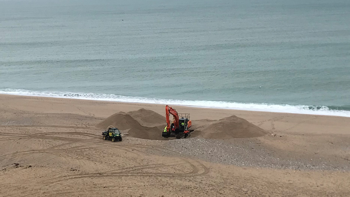 Work on site was brought forward following a cliff collapse during a storm in early 2018, which exposed the tunnel under the cliff and led to blockage from sea-blown sand. This had the potential to raise water levels in Loe Pool to dangerously high levels, so the EA commenced over-pumping operations whilst the contractor mobilised to site.