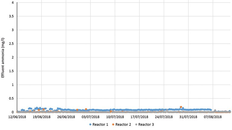 Figure 1 (above) shows the rapid increase in ammonia concentration with the onset of aeration and then the high rate of nitrification achieved (up to 7mg/l/hr), despite the low biomass concentration. Figure 2 (below) shows the discharge ammonia concentration of every batch for the last two months. Over this period, Nereda has achieved ammonia effluent quality of 0.03mg/l (average) and 0.10mg/l (95%ile).