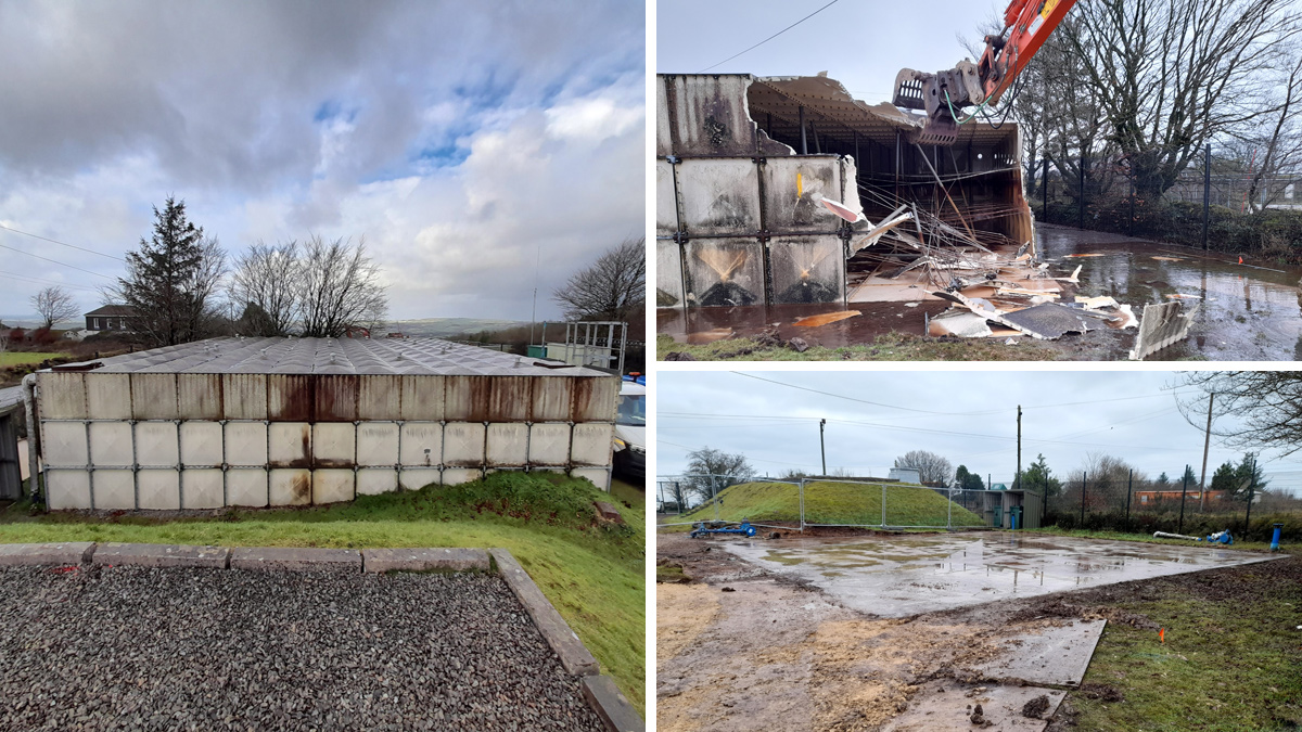Site mobilisation and demolition of the existing Braithwaite tank commenced in December 2021, with RM Penny Group employed to undertake the demolition work. The tank was broken up using a 20t excavator with a selector grab attachment. The GRP panels were ripped into manageable pieces with the stainless steel reinforcement bars segregated for recycling.