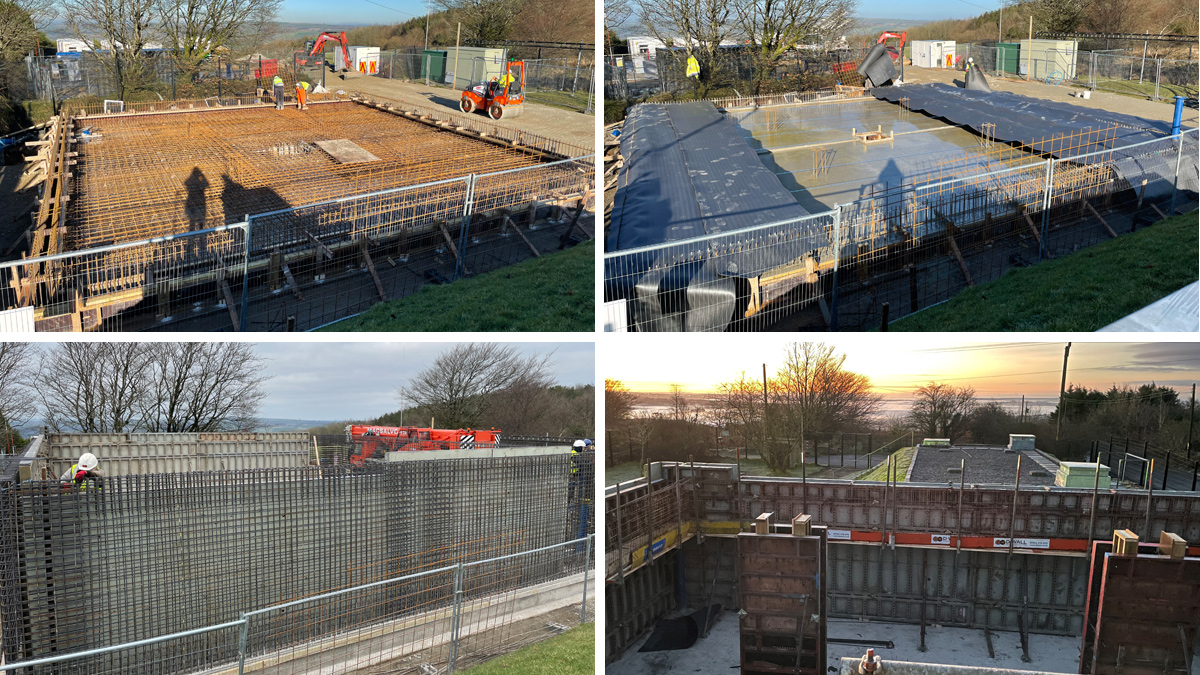 (top left) Installation of steel reinforcement for new reservoir on existing tank slab, (top right) frost blanket placement as pour undertaken late January 2022, (bottom left) steel reinforcement for tank wall with internal shutter erection and (bottom right) column and wall shutters ready for concrete pour – Courtesy of Galliford Try