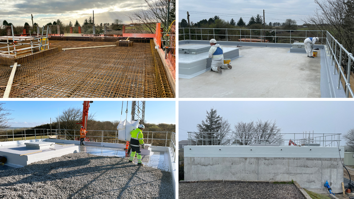 (top left) Steel reinforcement and shutters ready for roof slab pour, (top right) Application of waterproofing pain system to roof slab and top of walls/upstands, (bottom left) placement of stone cover to reservoir roof slab, and (bottom right) the new reservoir is complete and undergoing water testing – Courtesy of Galliford Try