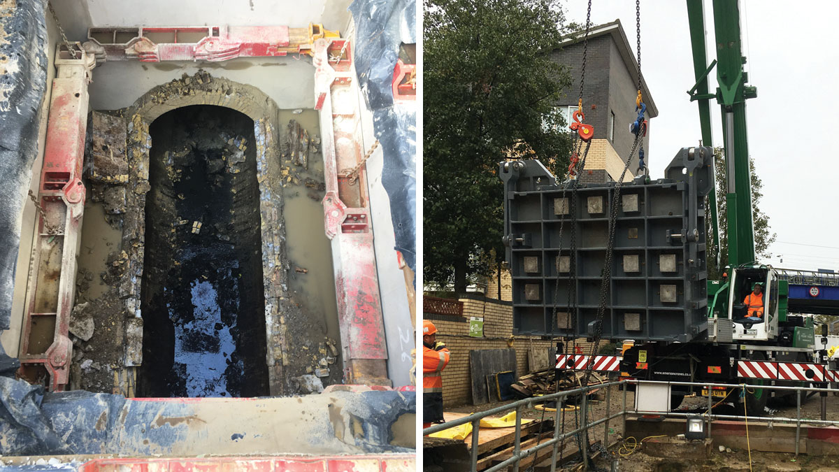 (left) Holloway Storm Relief Sewer post removal of the crown and (right) Weir chamber non-return valve being installed – Courtesy of J Murphy & Sons