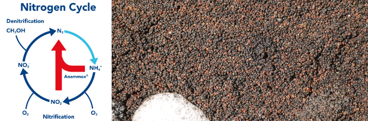Figures showing the anammox nitrogen conversion route and the red bead like annamox bacteria – Courtesy of Black & Veatch