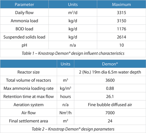 The design characteristics of the Demon® plant at Knostrop, the UK’s biggest Demon® reactor are shown in Tables 1 and 2.