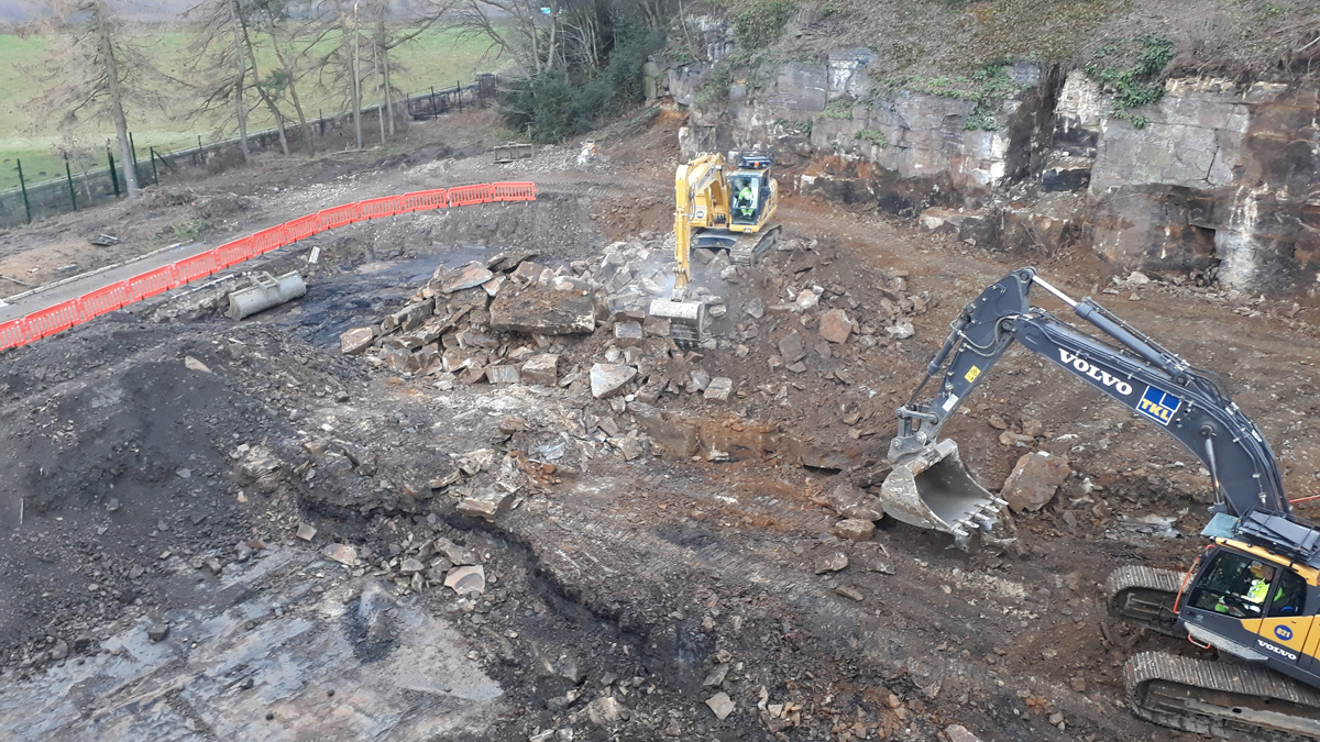 The proximity of the existing 8m high quarry face immediately adjacent to the works area necessitated consideration of measures to protect personnel and assets from potential rockfalls both during construction and after completion of the works. To address this, a system of temporary and permanent rockfall netting was installed around the working area by CAN Geotechnical. This netting is to be tested on a yearly basis to ensure continued safety.