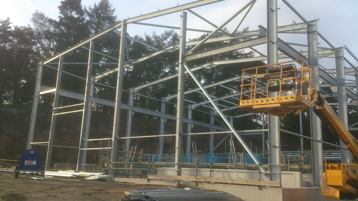 The substructure was substantially completed and hydraulically tested by September 2018 to allow erection of the superstructure, which comprises a steel portal frame building approximately 33m long x 22.5m wide x 11.5m high with external profiled steel sheet cladding. The portal frame incorporates longitudinal crane rails at high level to accommodate a 5t SWL travelling crane beam which can service the whole process area footprint within the building.