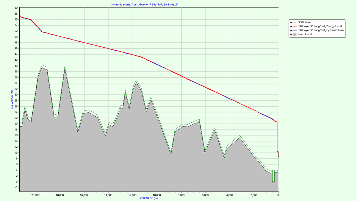 The pipeline from Layer to Langford would operate as a gravity main, with the upstream head being set by the pressure in the rising main at the take-off point. With approximately 5 bar of available driving head, the flow out of the pipeline will be controlled by a downstream flow control valve. The pipe sizes have been selected to ensure a positive pressure is available throughout the pipeline and to provide sufficient differential pressure at the outlet at maximum flow.