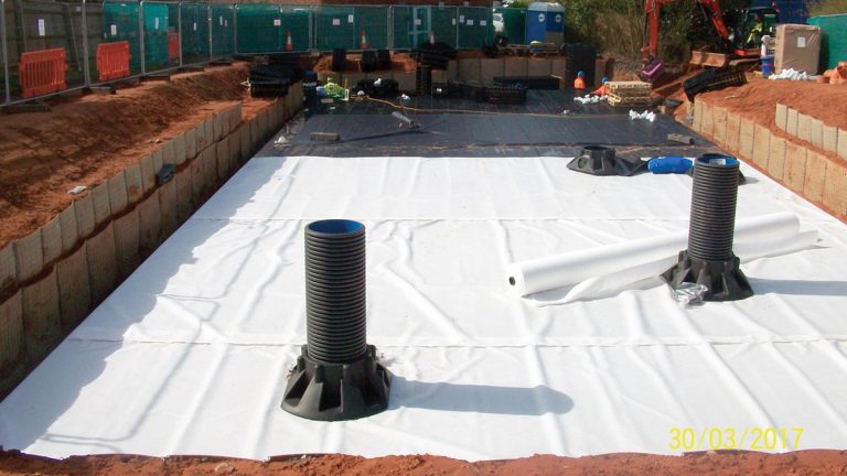 The risk of sand infiltrating and silting up the crate system led to the decision to seal the tanks with a welded impermeable membrane, the joints of which were air tested to guarantee the watertightness of the system. The tanks were further wrapped in a geotextile fleece to protect the membrane from any accidental puncturing during backfilling operations.
