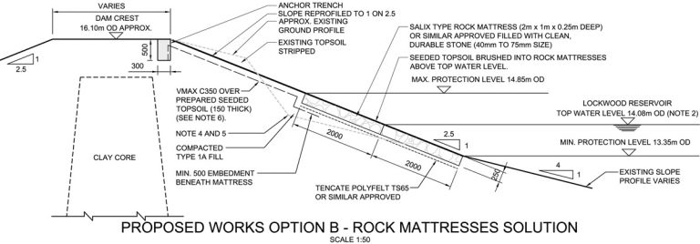 The second phase of work, the embankment protection, began in September 2017 and was completed by November 2017. The contractor, Salix, supplied and installed the rock mattresses and is the only company to be using this type of rock mattress in the UK, with Lockwood Reservoir understood to be the first time they have been used on a UK water company reservoir. The entire project was taken over by the client on 27 November 2017.