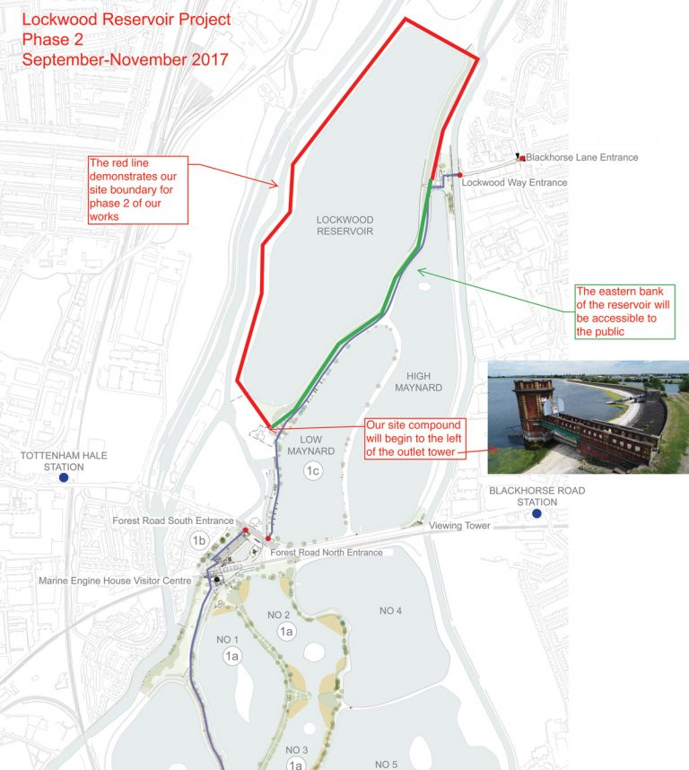 Construction began in July 2017 starting with the construction of the crest road, which was completed September 2017. The crest road works required that the entire reservoir be fenced off from the public, so this was carried out first in order to remove the fencing from the eastern bank by September and open public access to that side of the reservoir. This was driven by Walthamstow Wetlands’ opening of the site in October 2017, following their works to make the area more accessible.