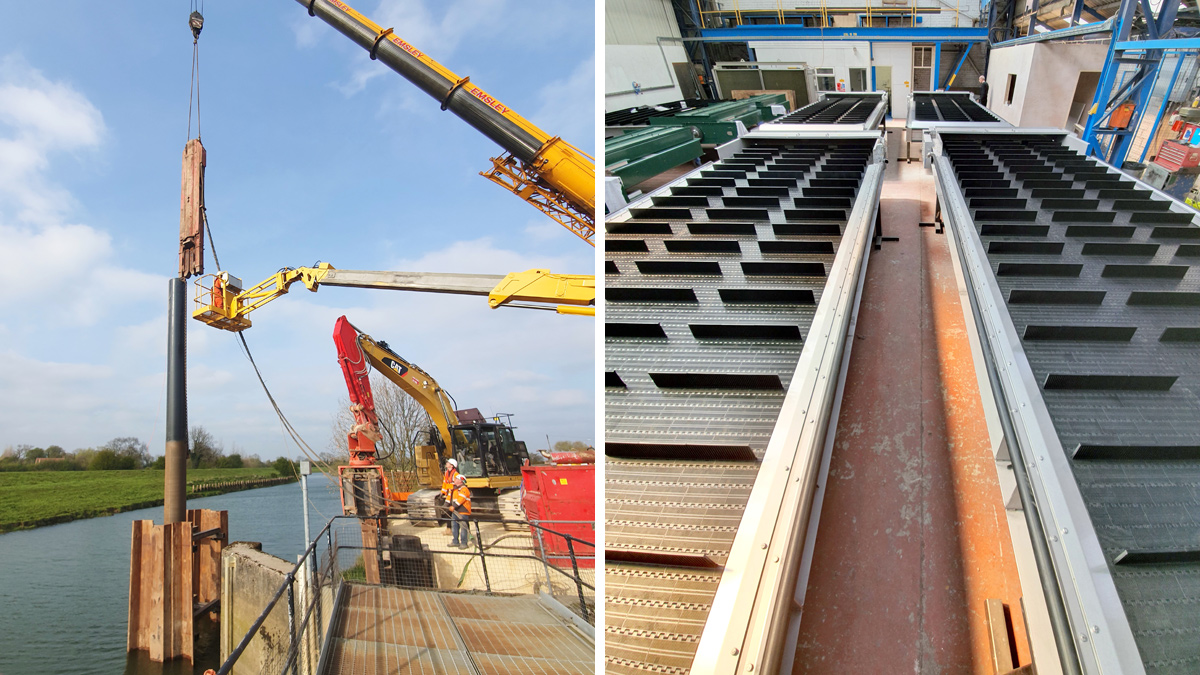 (left) 600mm diameter tubular piles being installed in the River Derwent and (right) Hydrolox Screens ready for shipping – Courtesy of Yorkshire Water and Ward & Burke