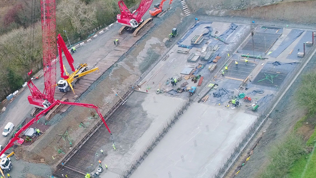 Due to the remote nature of the site, a one-way system was agreed with the Department for Infrastructure to manage the safe movement of construction traffic to and from site. This ensured a sufficient and timely supply of concrete was available on site when required, while ensuring both the safety of site vehicles and other road users. Base pours were completed using 2 (No.) 52m truck mounted concrete pumps (with a third pump available on standby should the need arise). Concrete was delivered to the required location by tremie pipe and levelled using a remotely operated, self-propelled screed unit equipped with the latest survey technology to achieve the required gradient of 1:100 at any location on the base.