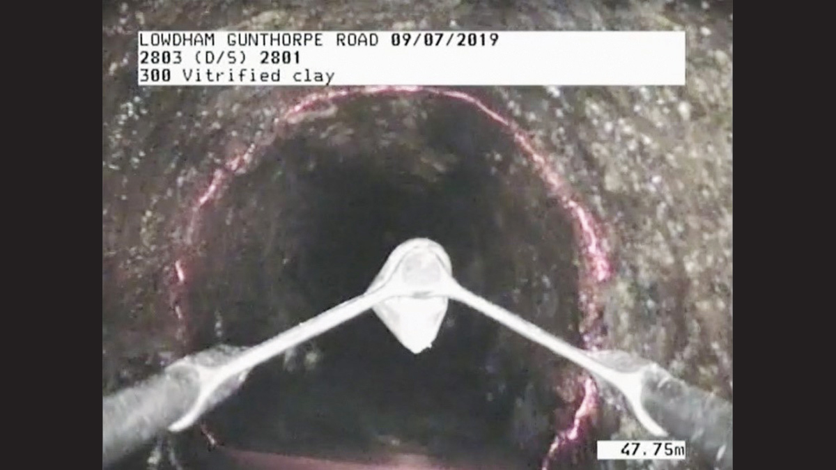 Cleansing sewer beneath rail track: All of the flows to the south of the village catchment including Gunthorpe Road gravitate via a 300mm vitrified clay (VC) sewer beneath the Nottingham to Lincoln Railway. ST records showed that the sewer material changed to a 225mm cast iron beneath the rail track before increasing back up to a 300mm VC sewer.