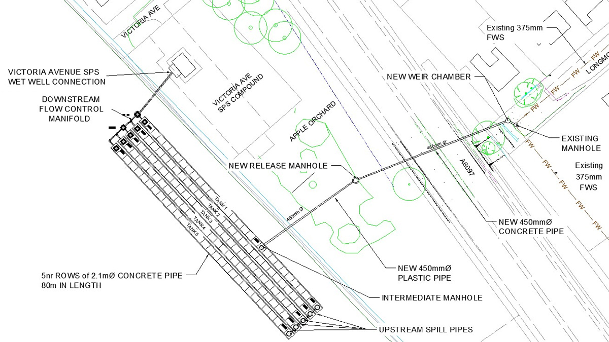 - A new 450mm Ø sewer beneath the A6907 connecting into Tank 1.