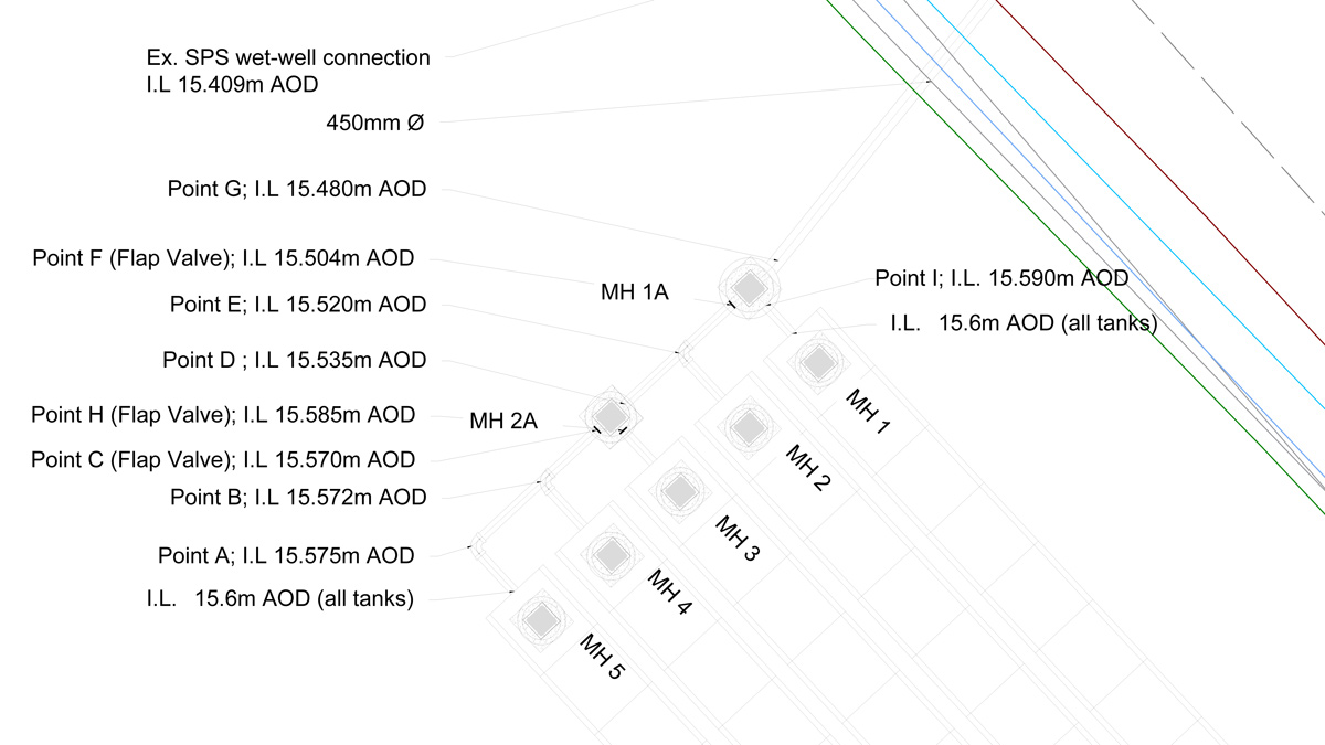- 5 (No.) bespoke downstream manholes with gravity control manifold to allow sequential emptying.