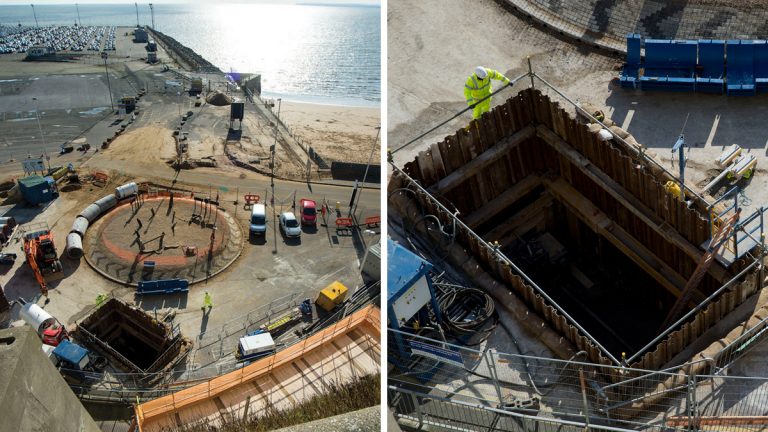 (left) Military Road drive pit with traffic management ensuring access to the Port and (right) access point to the new tunnel that links to the shaft bringing wastewater down from the top of the cliff – Courtesy of Southern Water