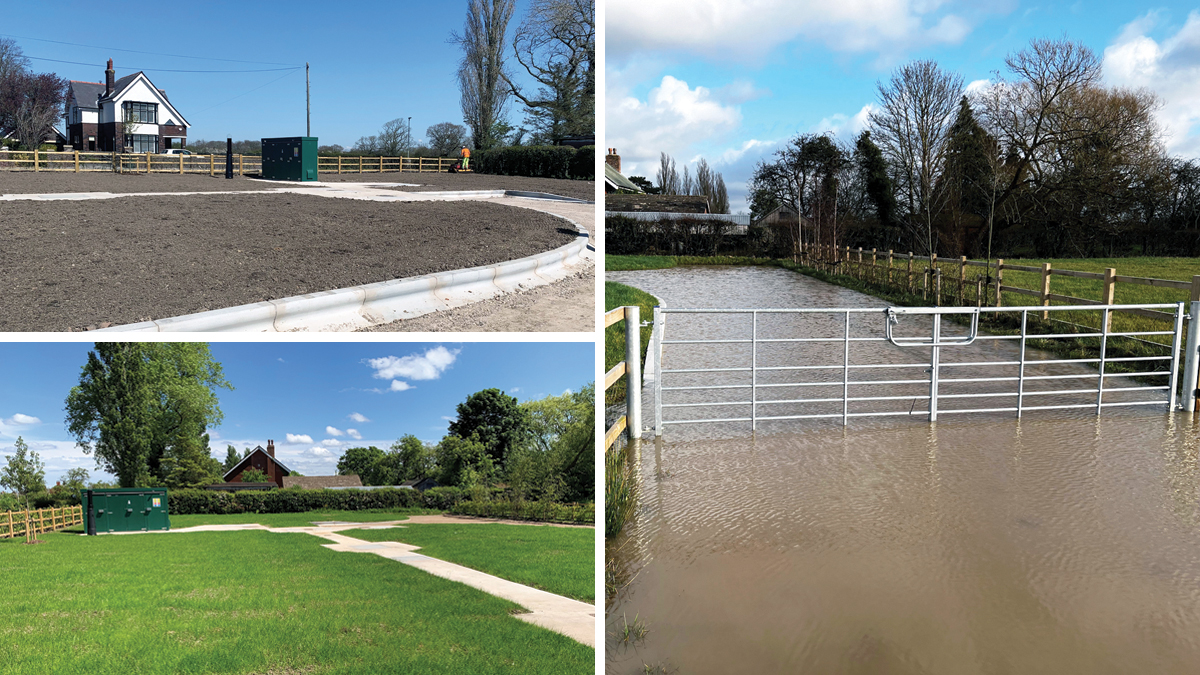 (top left) Detention tank site reinstated pre-seeding, (bottom left) completed works and compound and (right) flooded compound following heavy rain – Courtesy of United Utilities