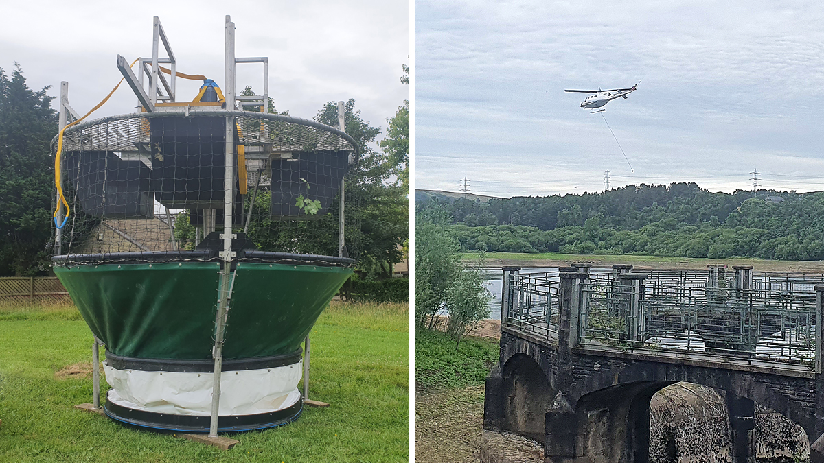 (left) Gurney Environmental mixer prior to the helicopter lift and (right) Helicopter lifting the mixer into place at Wayoh Impounding Reservoir – Courtesy of Costain