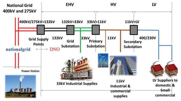 In the UK, electrical power is transported from power plants to customers via the electricity grid network by transmission and distribution network owners. The transmission system typically operates at 400kV or 275kV (132kV in Scotland), whereas the distribution system operates at voltages from 132kV to the normal household voltage of 230kV. The 400kV and 275kV substations each service more than 250,000 people.